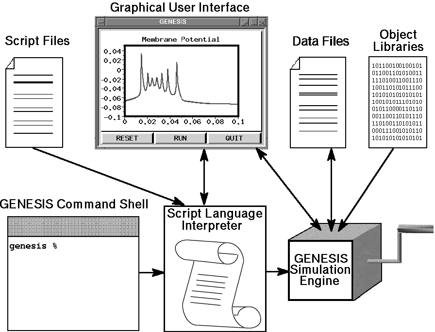 GENESIS uses a high-level simulation language to construct neurons and their networks. Commands may be issued either interactively to a command prompt, by use of simulation scripts, or through the graphical interface. A particular simulation is set up by writing a sequence of commands in the scripting language that creates the model itself and the graphical interface for a particular simulation. The scripting language and the modules are powerful enough that only a few lines of script are needed to specify a sophisticated simulation. The principal components of the simulation system and the various modes of interacting with GENESIS are illustrated below.